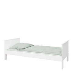 The Alba single bed from Steens. Made from sturdy, durable MDF. The simple white finish matches any child's room. Combine with other Alba storage options and safety rails to complete the look. Optional under bed drawer sets and a pull out bed are available for purchase separately, offering a space saving solution and ample storage. Bedslats are included with this bed.