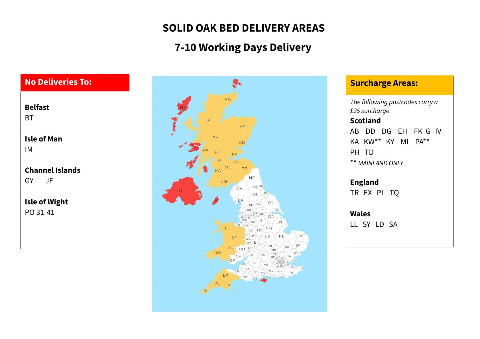 Our standard FREE delivery service applies to UK mainland postcodes only. We currently do not serve areas outside UK mainland including Scottish Offshore (KW15-17, ZE, HS, PA20, 41-49, 60-75, 77-78, KA27-28, PH40, 42-44), Scilly Isles (TR21-25), Northern Ireland (BT), Channel Islands (GY, JE), IOM (IM), Eire and BFPO addresses. Some UK Mainland postcodes may incur a surcharge of £50 - £250.
