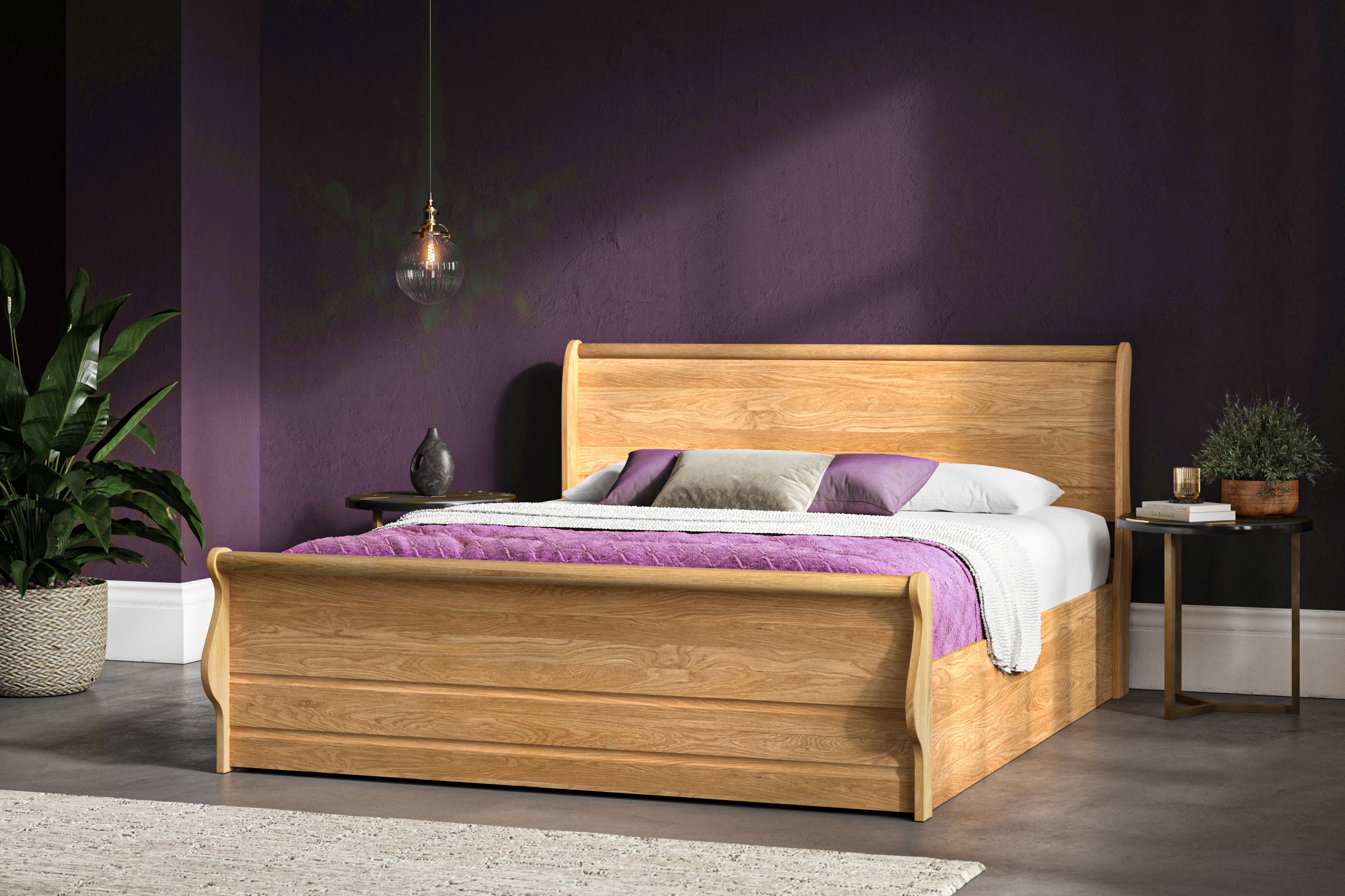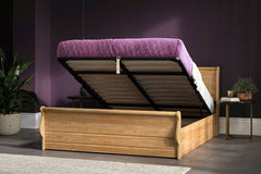 Experience the ultimate in comfort and style with the Woodwine solid oak ottoman bed frame. Crafted from premium solid oak with a clear waxed finish, this exquisite piece of furniture features a sleek and stylish design. Its clean lines and elegant silhouette make it a perfect addition to any bedroom decor. The gas lift mechanism allows for effortless lifting, revealing a spacious storage area that helps keep your bedroom tidy and clutter-free. The high foot end of the bed showcases a stunning sleigh design, adding a unique personality and a sense of timeless elegance and charm. Available in double, king, and super king sizes, the Woodwine solid oak ottoman bed is a perfect fit for any bedroom. Its plush upholstery and sturdy construction ensure a comfortable and restful night's sleep every time. Transform your bedroom into a luxurious retreat with this statement piece that exudes quality and craftsmanship. The Woodwine solid oak ottoman bed frame is the ideal choice for those seeking both comfort and style in your bedroom.