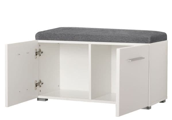 The Beny White Gloss Shoe Bench Storage with Grey Cushion Seat offers a stylish and practical solution for entryways or bedrooms. With its grey cushion seat, it provides both comfort and style. Featuring two doors, it offers ample storage space for shoes, keeping your space tidy and organized. This bench seamlessly combines functionality with modern design, adding a touch of elegance to any room.