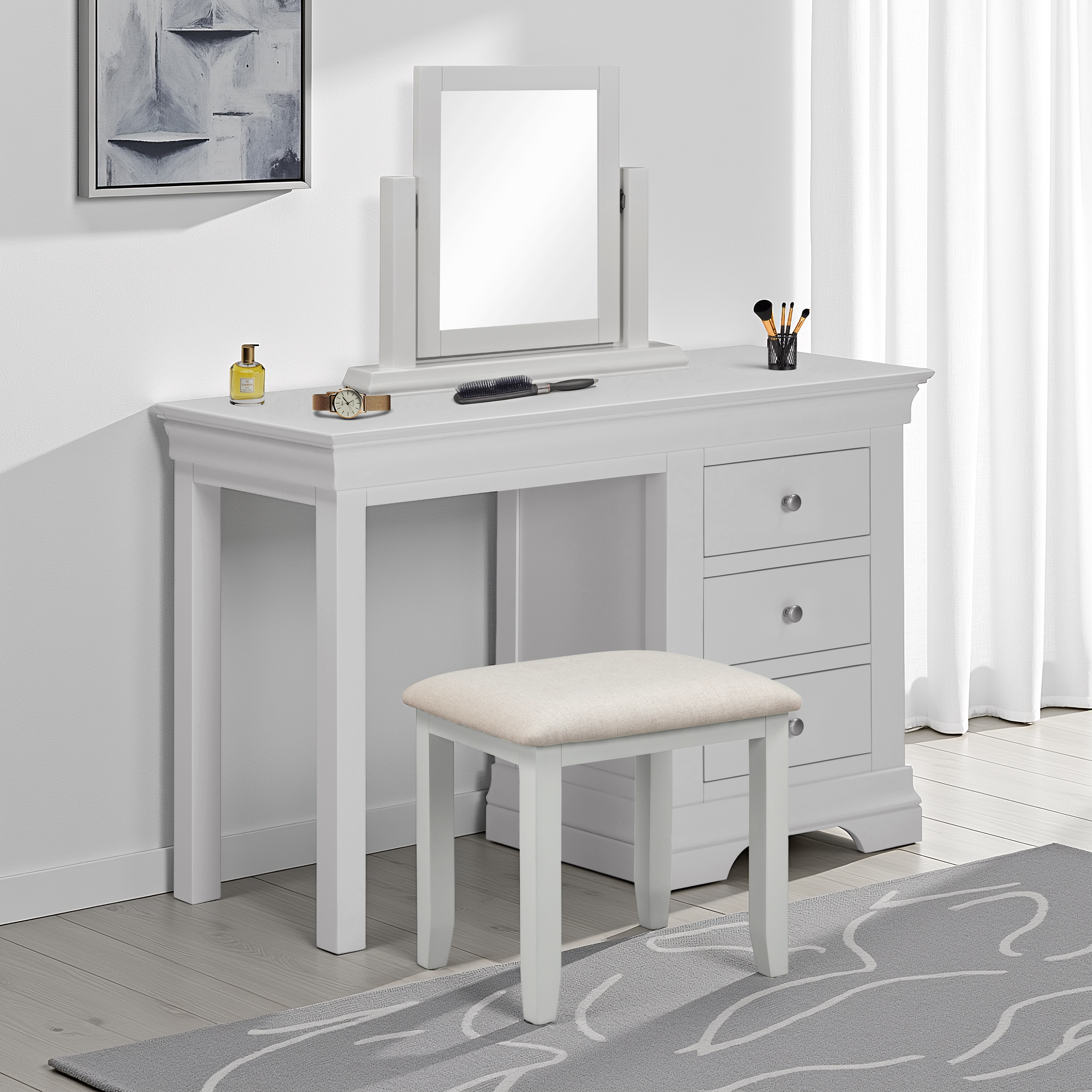 HARDWOOD, MDF, PAINTED FINISH (MATT), PLYWOOD BACK PANEL, PLYWOOD DRAWER BASE, METAL AND WOODEN HANDLES, FABRIC, FOAM, NON-WOVEN, MIRRORED GLASS Extra Information