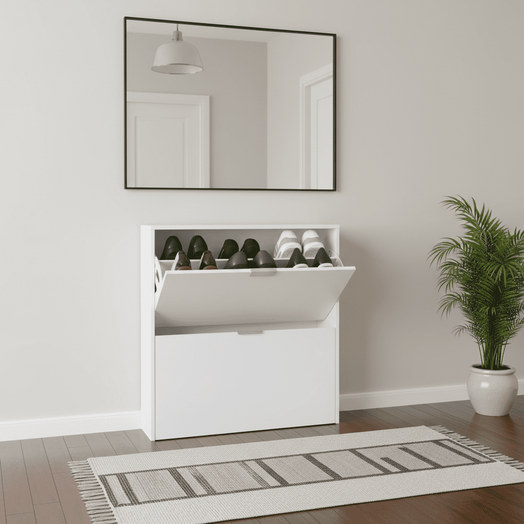 The Brilo Matt White 2 Drawer Shoe Cabinet is a sleek and efficient storage solution for your footwear. With two revolving drawers, it maximises accessibility and space efficiency. Its capacity of 16 pairs (depending on shoe size) ensures ample storage for your collection. Perfect for keeping your entryway or bedroom organised, this cabinet combines style with practicality.