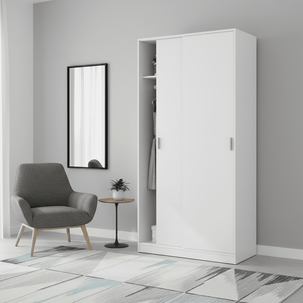 Introducing the Hansen White Small Narrow Sliding 2 Door Wardrobe. This sleek wardrobe features two sliding doors, one hanging rail, and one shelf, offering efficient storage in a compact design. Its clean white finish and narrow profile make it a perfect fit for smaller spaces, providing stylish and practical organization for your clothing and accessories. Elevate your room with the modern and functional Hansen wardrobe.