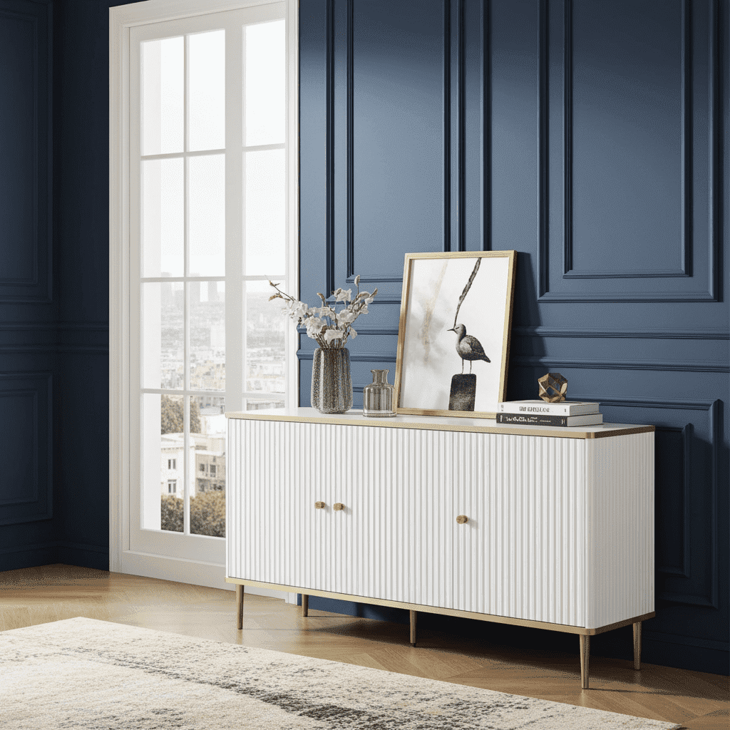 The luxurious Maison large sideboard in white with gold detailing. This unit features 3 doors and internal shelves.